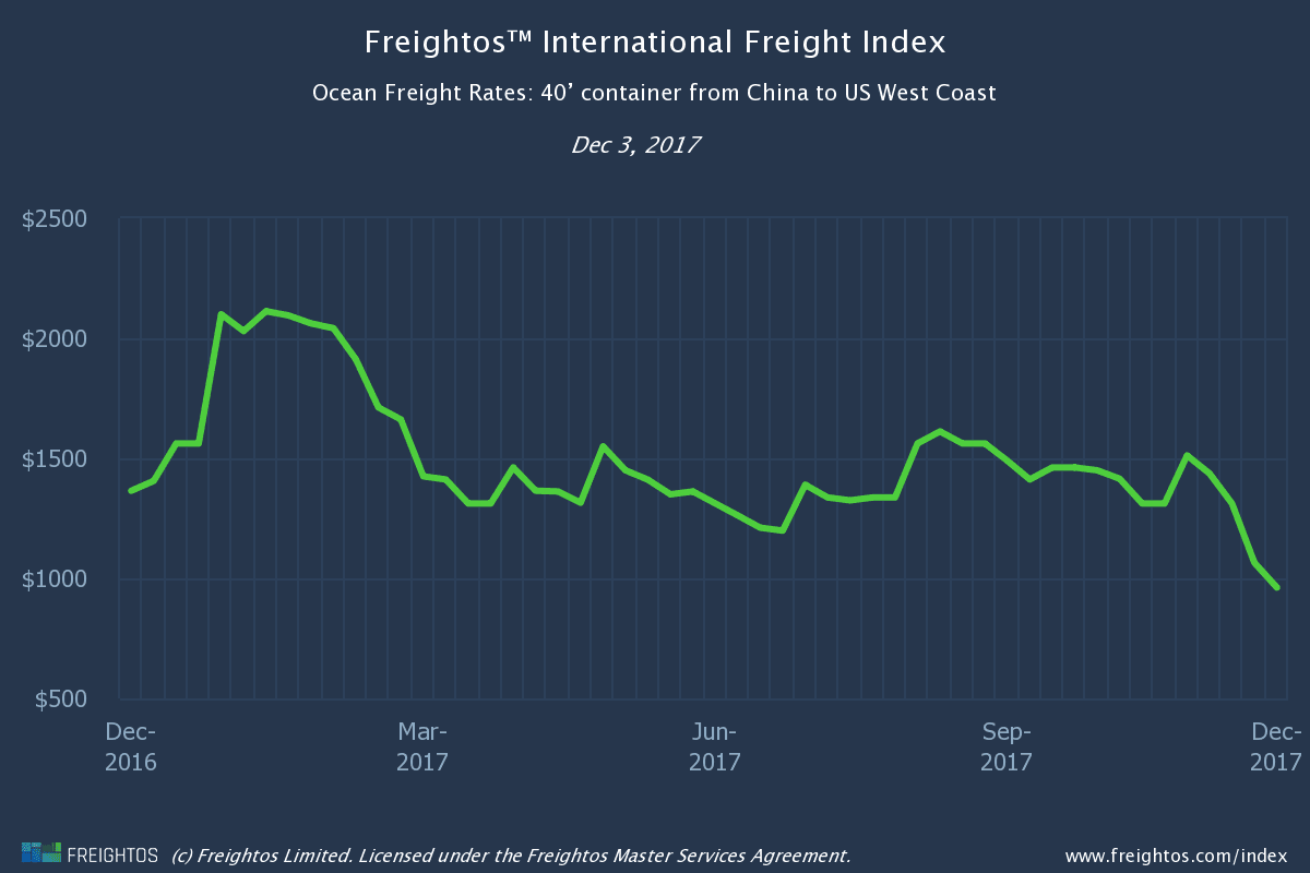 Без проблем с пропускной способностью на какой-либо полосе, GRI 1 декабря нигде не видно. Экспедиторы Freightos Marketplace либо снижают ставки, либо расширяют свои ноябрьские ставки. С январским традиционным предкитайским новогодним ураганом, ключевым вопросом сейчас является то, насколько ниже могут упасть 40-ценные цены?