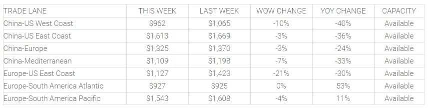 Несмотря на то, что в пиковый сезон хорошо, цены на Западное побережье Китая и США снова упали на этой неделе (падение на 10%) и достигли нового минимума за год. В настоящее время они отслеживают 40% по сравнению с прошлогодними ставками.